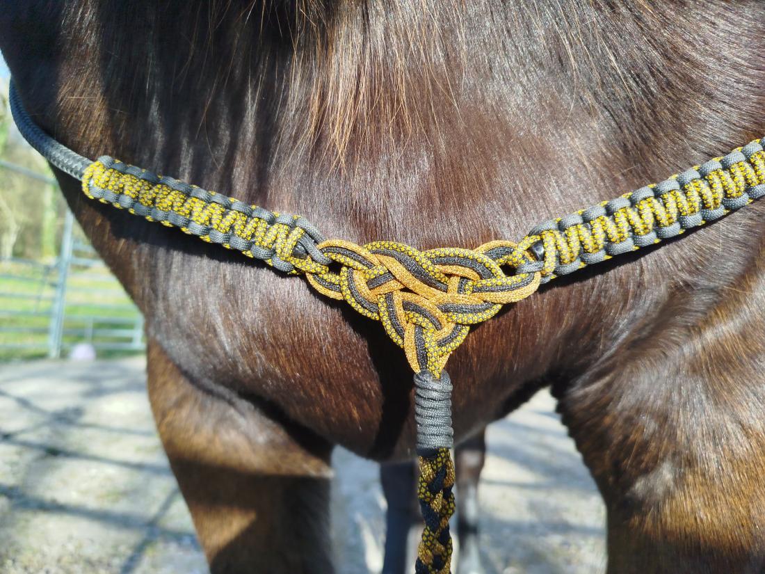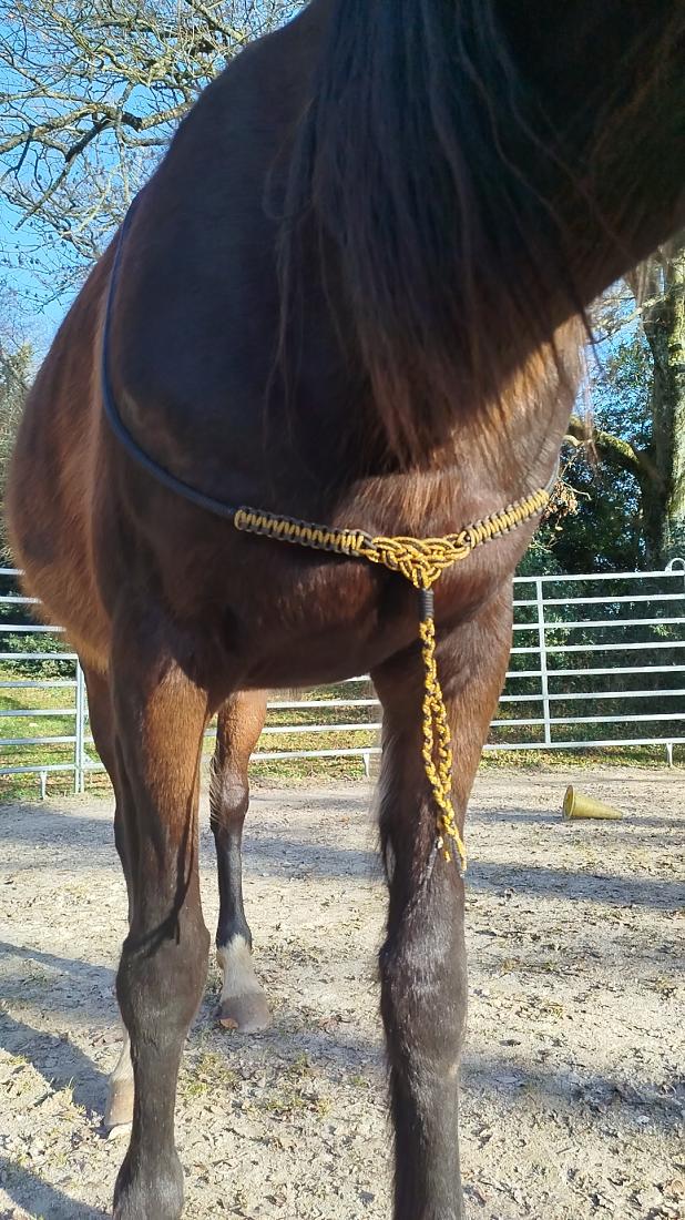 Le nœud central, d’origine celtique, n’est pas là seulement pour l’esthétique. Il représente l’harmonie entre le cheval et l’humain, le respect mutuel, et la volonté de progresser ensemble avec finesse. Utilisée comme cordelette de travail à pied ou cordelette montée, la Celtamor est un outil léger, direct, qui s’adresse à ceux qui ont déjà posé des bases solides avec leur cheval.