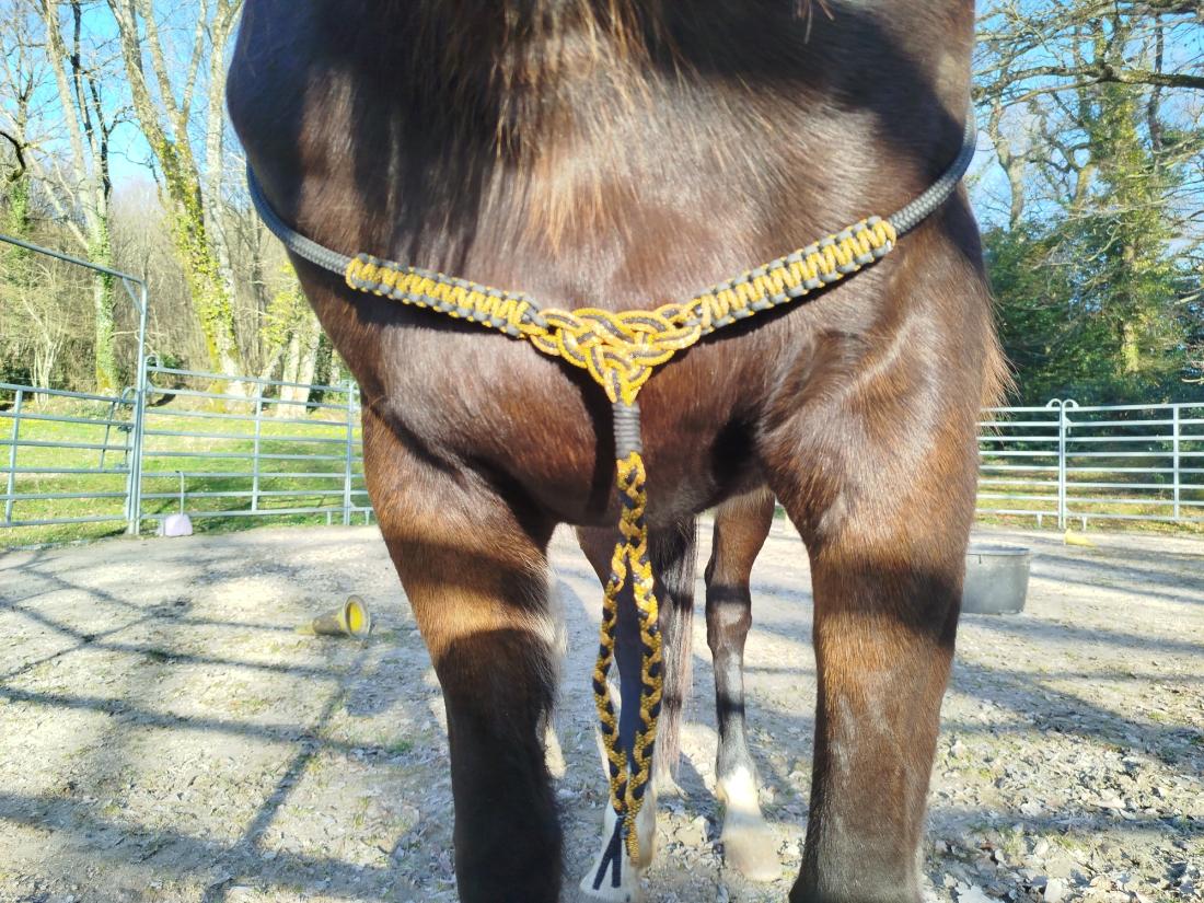 Le nœud central, d’origine celtique, n’est pas là seulement pour l’esthétique. Il représente l’harmonie entre le cheval et l’humain, le respect mutuel, et la volonté de progresser ensemble avec finesse. Utilisée comme cordelette de travail à pied ou cordelette montée, la Celtamor est un outil léger, direct, qui s’adresse à ceux qui ont déjà posé des bases solides avec leur cheval.
